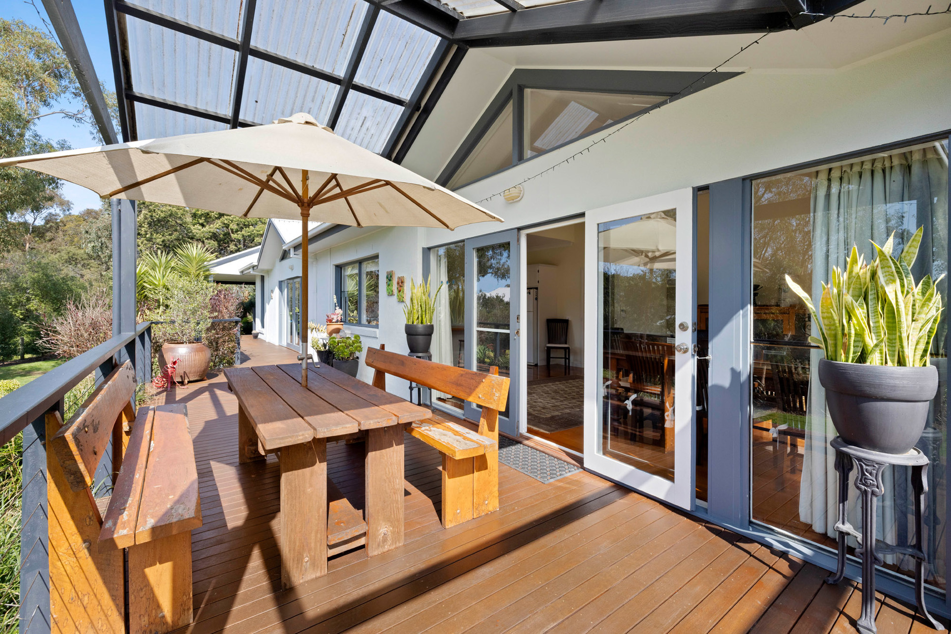 Barely 700m from the beach, the charming three-bedroom plus study residence features two living areas and a sunny north-facing entertaining deck and veranda ready to host large gatherings of family and friends.